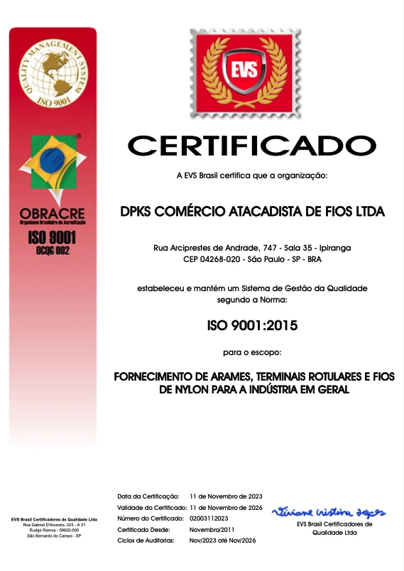 Atuando no fornecimento de arames, terminais rotulares e fios de nylon para a indústria em geral, a DPKS consolida sua responsabilidade com a qualidade em todas as etapas — do atendimento à entrega — fortalecendo relações de confiança com clientes, parceiros e o mercado.